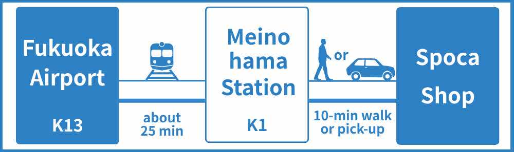 It takes about 25 minutes from Fukuoka Airport to the nearest Meinohama Station (direct train).